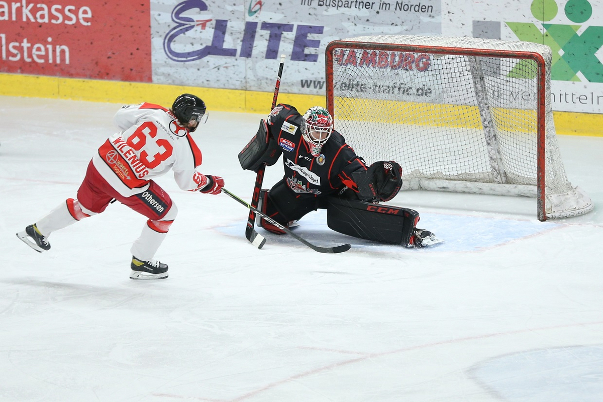 Nach der Niederlage gegen die EG Diez-Limburg Rockets am vergangenen Sonntag musste die Mannschaft von Trainer Jacek Plachta eine ordentliche Leistungssteigerung hinlegen, um gegen den Tabellenführer aus der Wedemark bestehen zu können – und die kam! Vom ersten Wechsel an zeigten sich die Hamburger hellwach, spielten einfach, zielstrebig und mit viel Kampfgeist. So dauerte es nicht lange, bis die Hausherren die Führung erspielten. In Überzahl versenkte André Gerartz die Scheibe zum 1:0 (4.). Die Gastgeber blieben dran und zwangen die Scorpions zu Strafen. Als die Mellendorfer Robert Peleikis und wenig später Roman Pfennings auf die Strafbank verabschieden mussten, schlugen die Hanseaten erneut zu. Norman Martens traf in doppelter Überzahl zum 2:0 (10.). Doch die Scorpions fingen sich und schlugen durch Jan Pietsch zurück (17.).